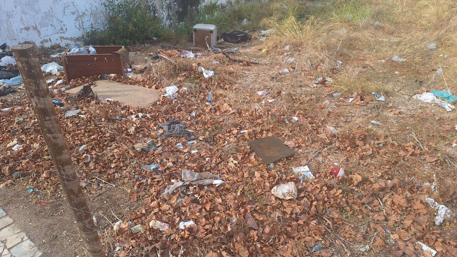 Terreno abandonado com entulho e vegetação