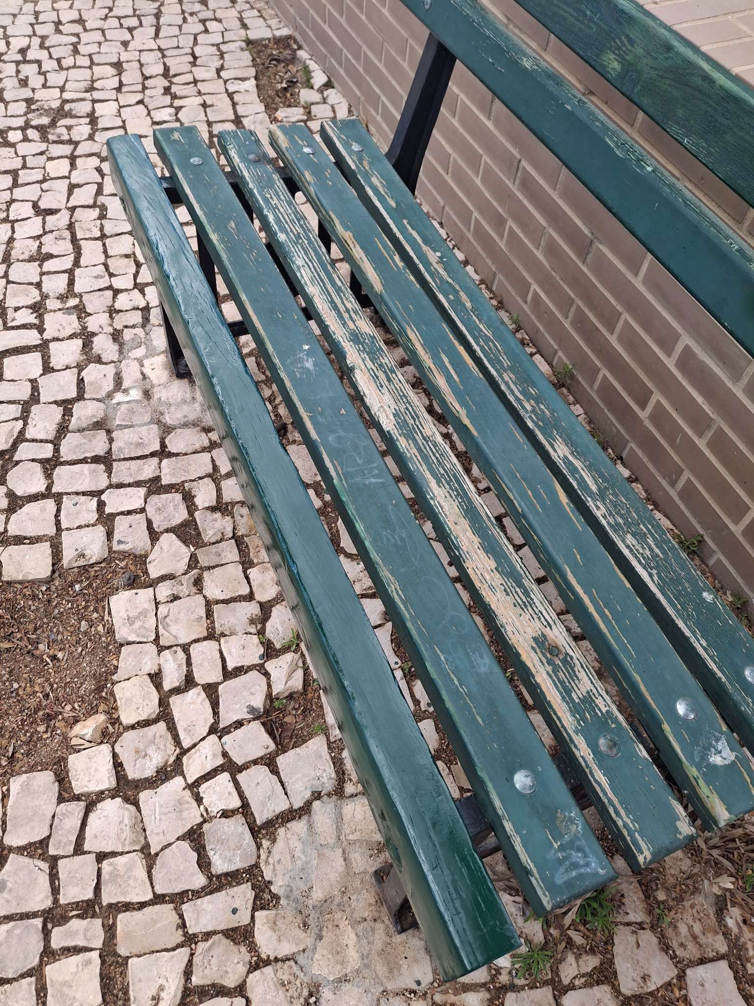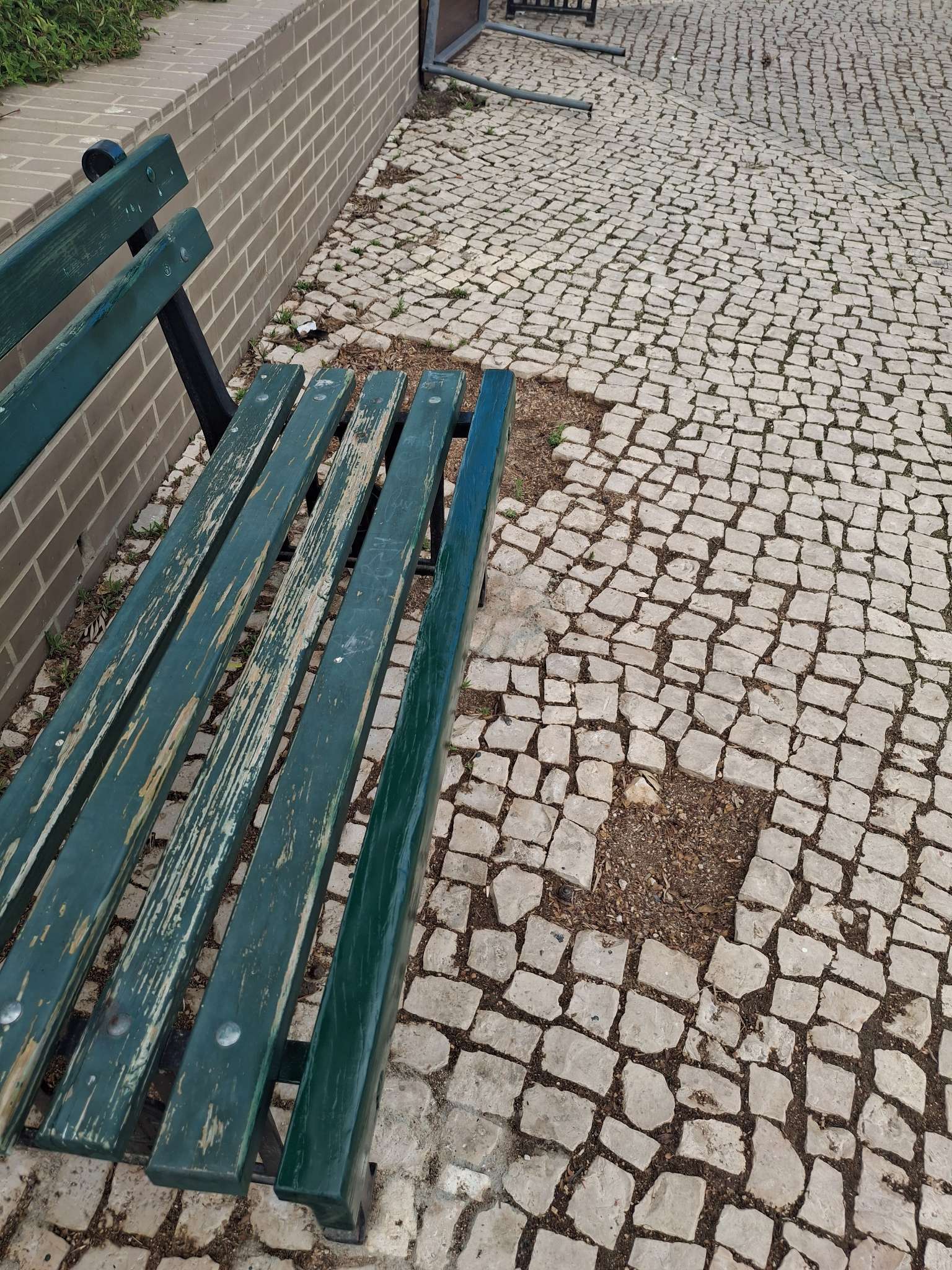 Banco de jardim danificado a várias semanas, espaço frequentado por crianças, podendo colocar em perigo as mesmas devido as madeiras partidas do banco.