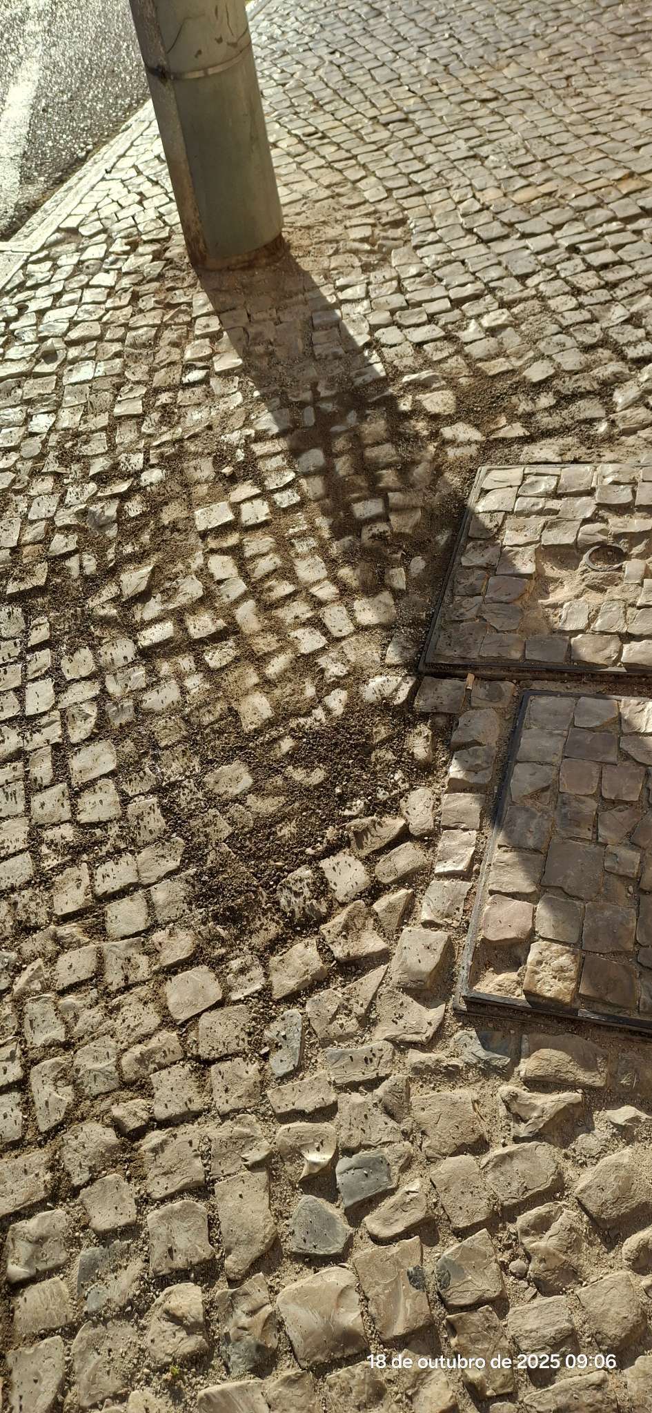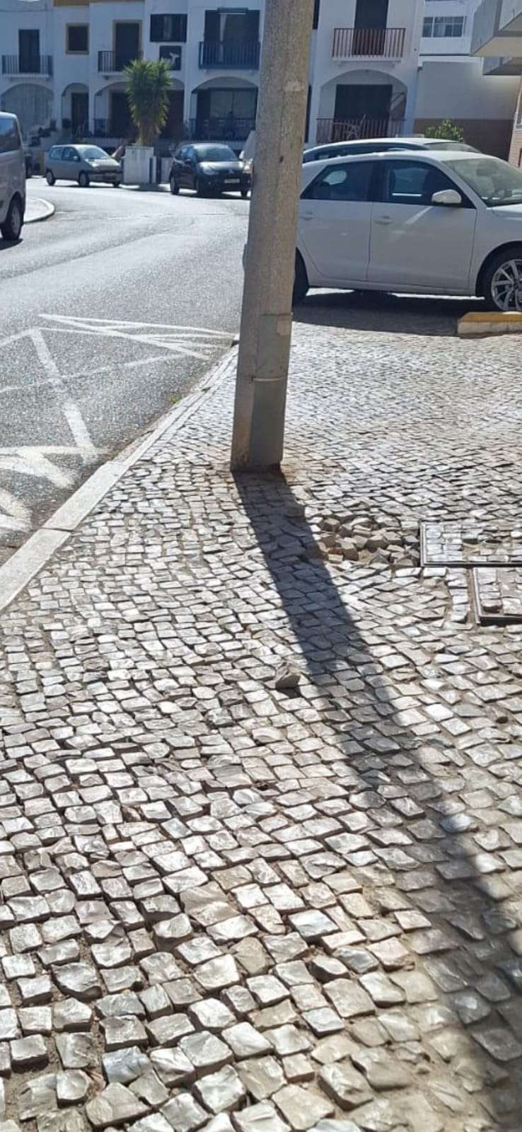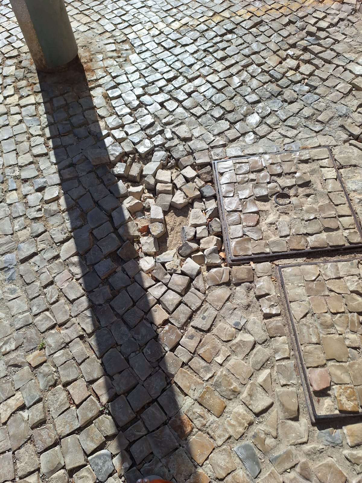 Buraco e pedras de calçada soltas, perto da Escola Secundária Dr. Francisco Fernandes Lopes. Muito perigoso!!!