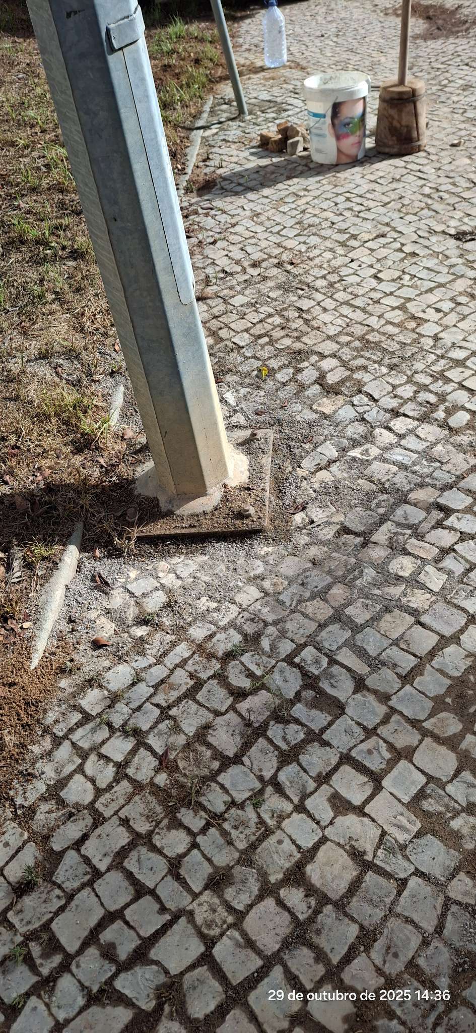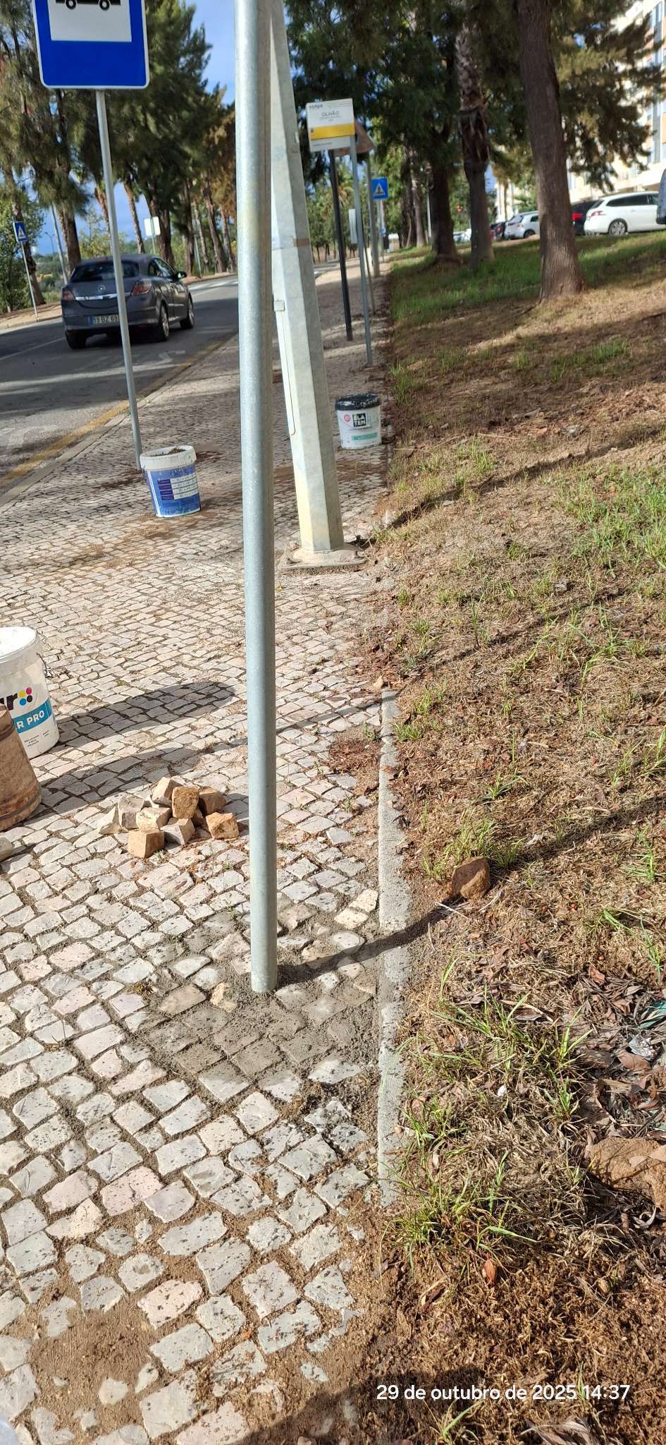 Pedras de calçada amontoadas, soltas. Em frente à paragem de autocarros /no outro lado da estrada. ver imagem, sff.