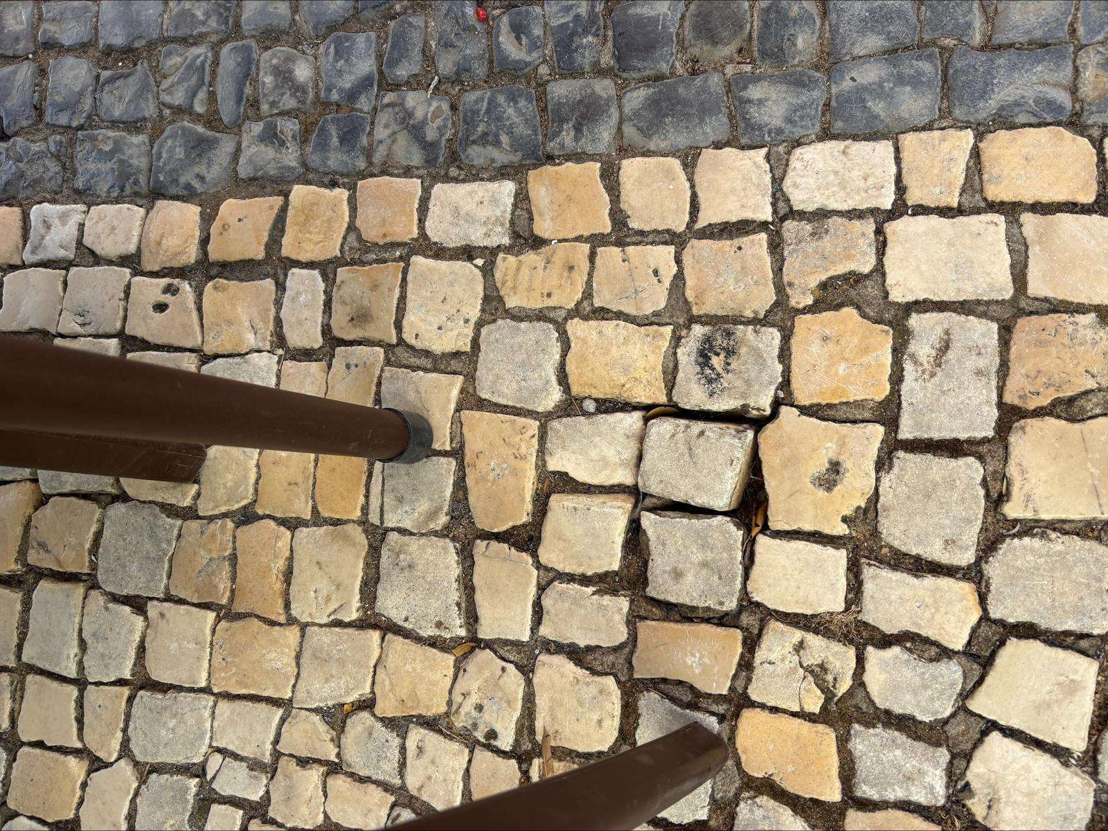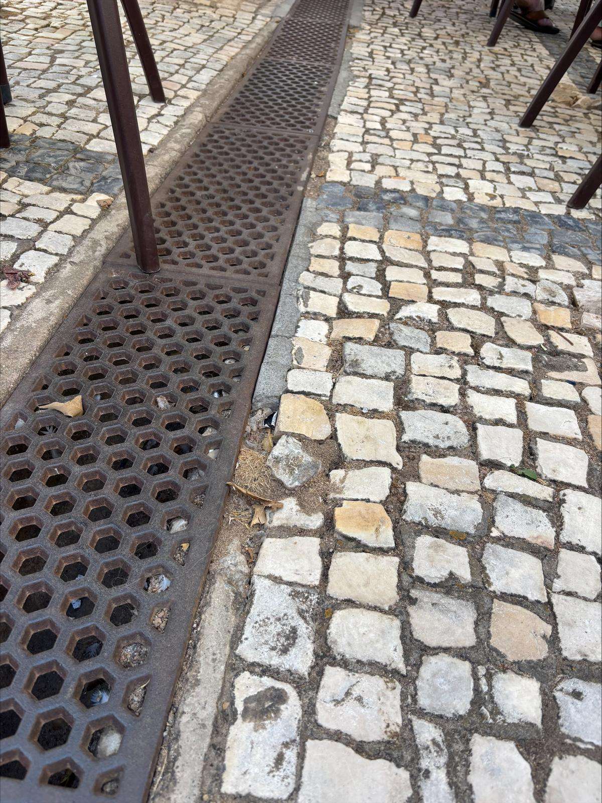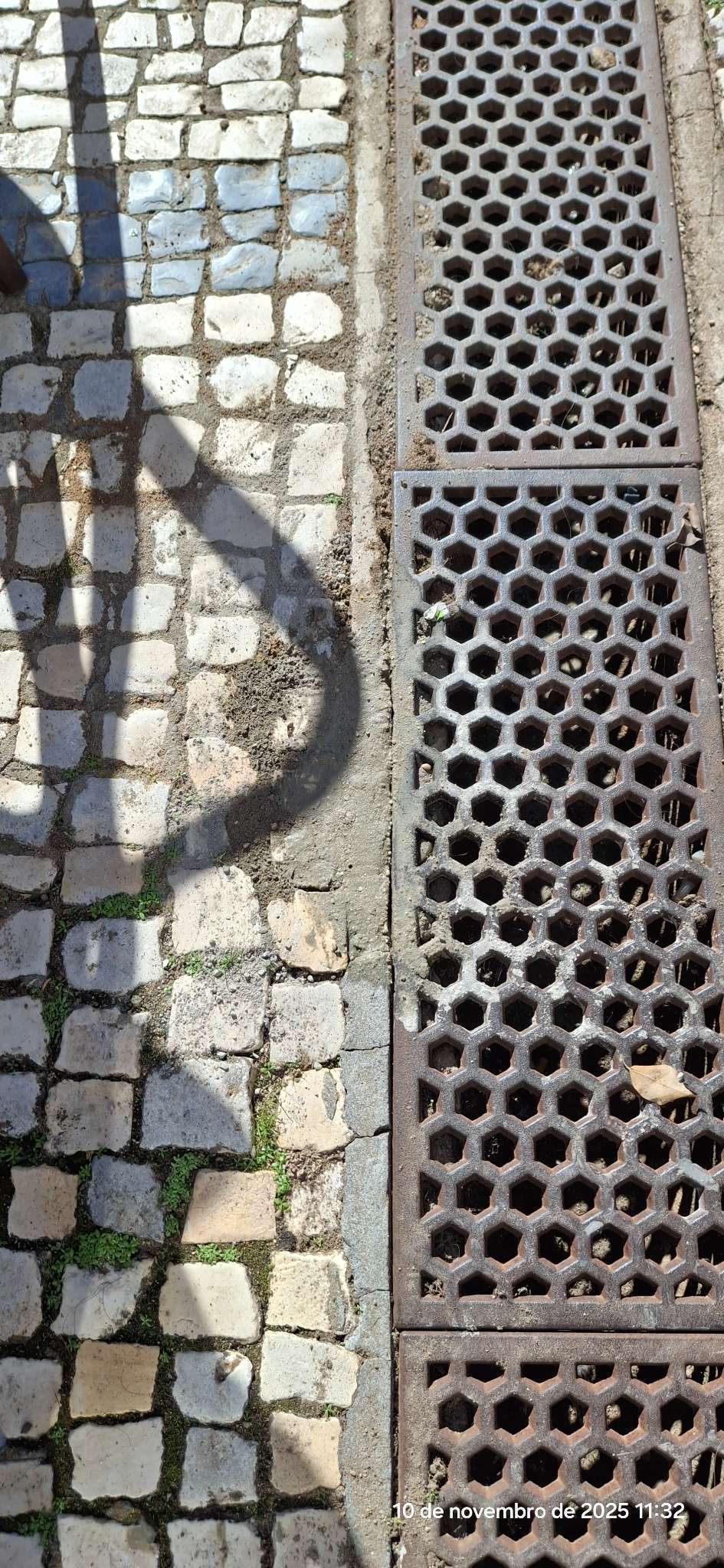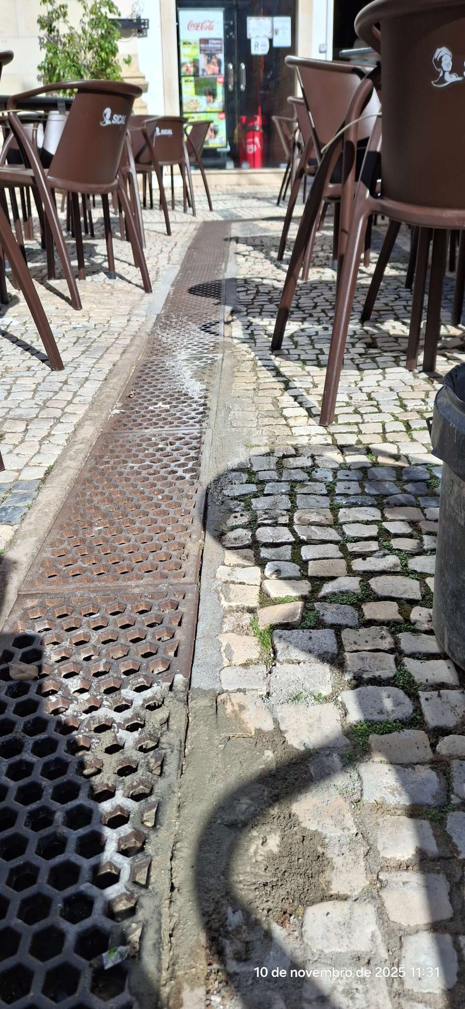Mau estado da calçada e da caleira central da Rua do Comércio, em particular na zona afeta à esplanada do café “La bicyclette”. Conforme registos fotográficos em anexo, é visível o avançado estado de degradação do piso, com desníveis, buracos, pedras de calçada soltas e instabilidade das grelhas. Apesar de alguns esforços que temos desenvolvido para minimizar este problema, a situação tem vindo a agravar-se devido à falta de pedras de calçada e à ineficaz contenção das grelhas.