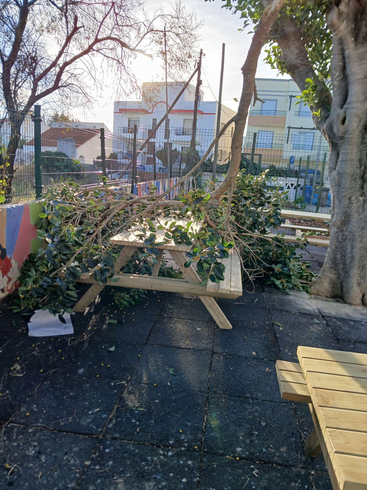 A árvore junto à horta já na semana anterior perdeu um tronco pequeno. Hoje soltou-se um tronco enorme que caiu mesmo em cima de uma das mesas de piquenique que haviam acabado de ser colocadas, por isso felizmente não se encontrava nenhuma criança lá sentada. Há mais ramos em risco de queda na mesma árvore (fotos em anexo), pelo que se solicita intervenção urgente. O espaço foi vedado com fita o que não impede que alguma criança para lá vá.