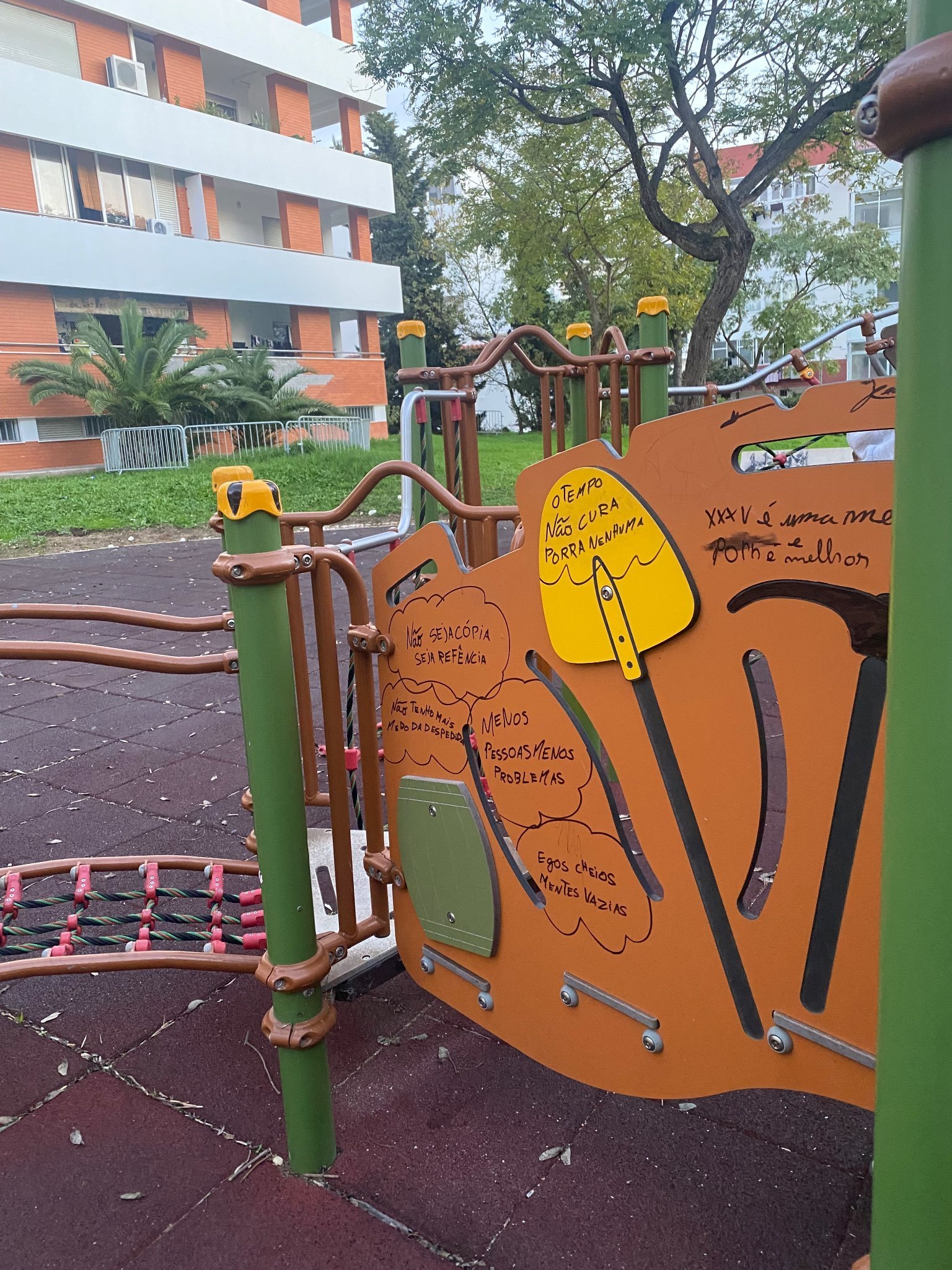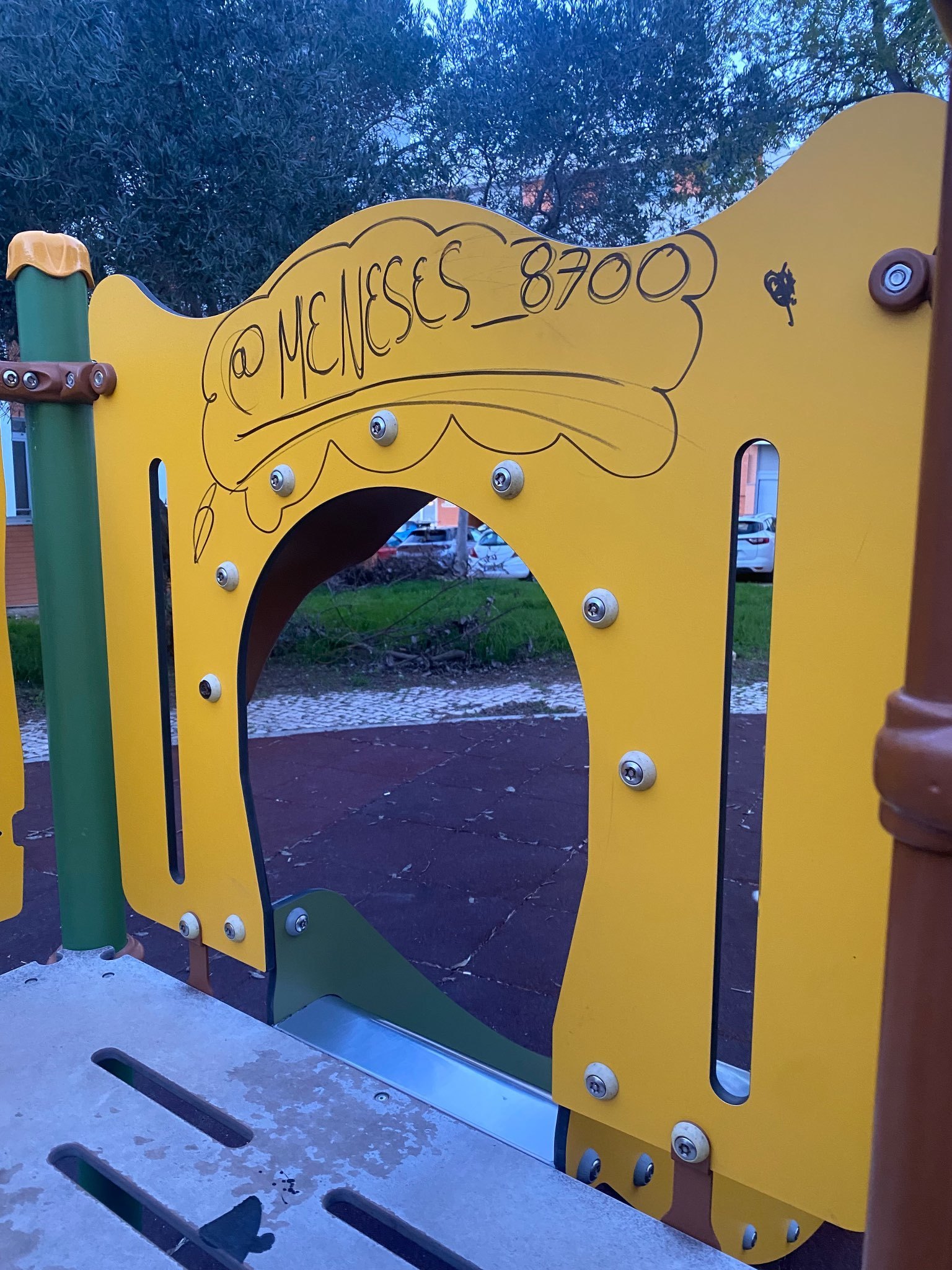 O parque infantil na Quinta das Flores, na Rua Rainha Santa Isabel encontra-se atualmente grafitado. É um espaço que é usado por muitas famílias e que tem estado em boas condições contudo neste momento e desde à cerca de duas semanas que se encontra grafitado. Peço à câmara municipal que proceda à limpeza dos grafitis, de forma a manter o parque seguro, agradável e adequado ao uso infantil.